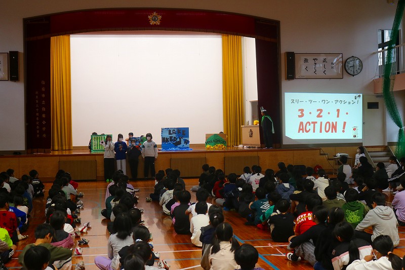 朝活動の時間に.スキットの発表が行われました。スキットとは.英語で演じる短い劇のことで,子供たちは11/29 スキット大会本選に向けて,昼休みを中心に練習を重ねてきました。本選は,6年チームが出場します。当日に練習の成果がしっかりと発揮されるよう,度胸試しも兼ねて全校の前で発表しました。6年の指宿の魅力をテーマにした劇はとても印象的でした。英語のセリフでありながら内容が分かりやすく,笑も交えながら地域の魅力を伝える発表でした。大会本選ではぜひ最高賞を目指してがんばってほしいです。