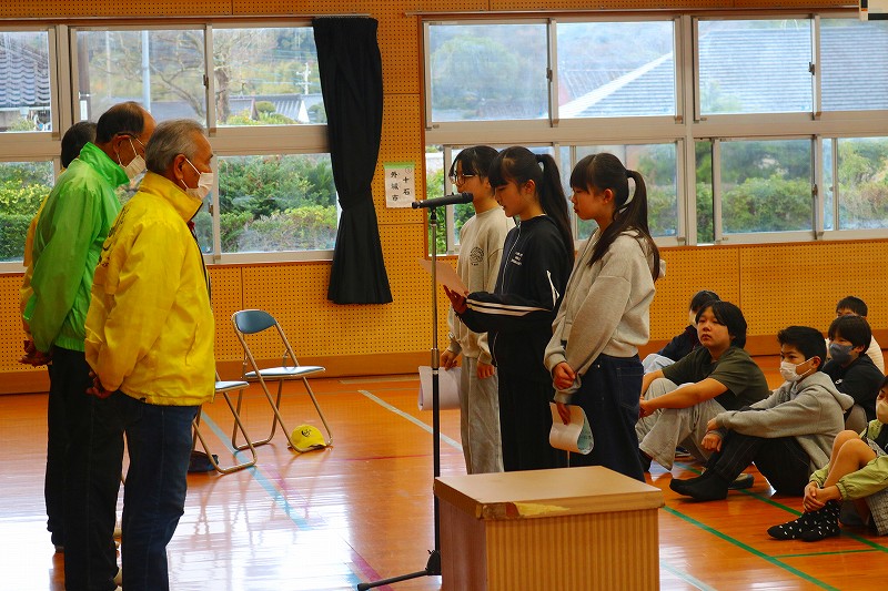 登校時に毎朝,通学路で立哨指導を行ってくださっている3名の地域の方を,学校にお招きして全校児童で感謝の気持ちを伝えました。晴れの日も雨の日も,指宿小の子どもたちを見守ってくださる3名の方には,感謝の気持ちでいっぱいです。